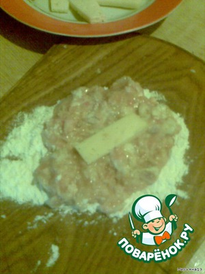 На доску насыпаем муку,берем не большое количество фарша,кладем его на муку и делаем не большую лепешечку на которую кладем кусочек сыра