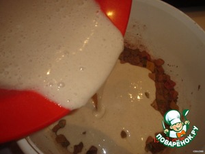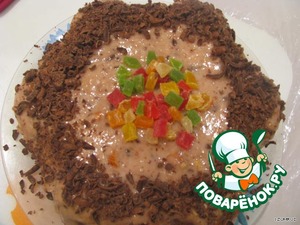 добавить варенье и желатин+ орехи крупно дроблёный и половику тёртого шоколада(вторую часть тёртого шоколада оставить для посыпки верхнего слоя торта) -