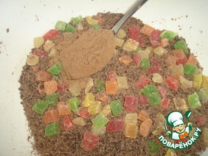 в отдельную посуду всыпать цукаты(немного оставить для украшения)+1 плитка шоколада натёртый на крупной тёрке+какао