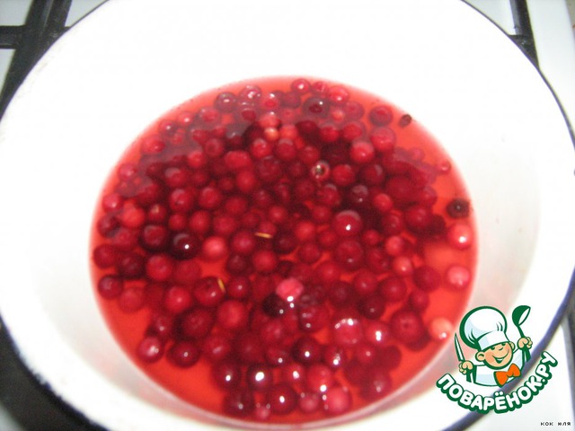 Готовим соус: Бруснику перебираем, моем, кладём в кипяшую воду, добавляем сахар.