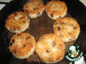 Готовый рис смешиваем с хорошо промытым изюмом, добaвляем сахар. Формуем биточки, пока масса не остыла (40-50 градусов). Панируем в булочной крошке.