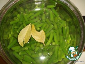 • Отвариваем зеленую фасоль в подсоленной воде с добавлением лаврового листа и перца.