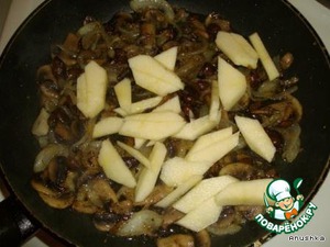 • Через 3 минутки добавляем опят. Перемешиваем.