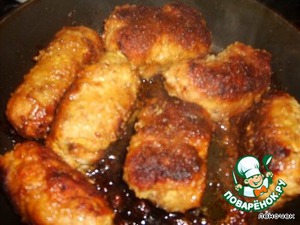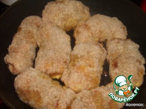Рулетики обмакнуть во взбитое яйцо, обвалять в панировочных сухарях, выложить на сковороду с разогретым сливочным маслом, жарить на сильном огне с обеих сторон в течение 10 мин