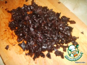 Предварительно замоченный чернослив обдать кипятком и нарезать маленькими ломтиками.