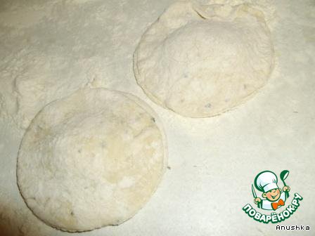Тесто тонко раскатываем порциями, вырезаем стаканом кружочки (верх и низ)