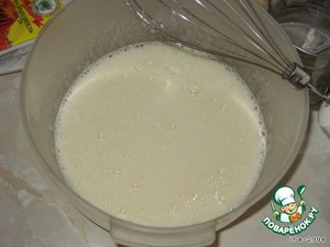Дальше добавляем молоко и растопленное масло. Опять все хорошо взбиваем. Муку просеять вместе с разрыхлителем и по одному стакану ввести в тесто.