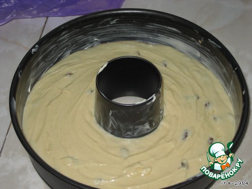 Выкладываем в форму, смазанную сливочным маслом. Внимание, форма должна быть довольно большая, т. к. наш кекс поднимается довольно высоко.
