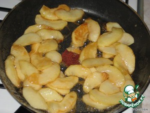 Яблоки чистим, режем на дольки и отправляем на сковородку, засыпаем сахаром.