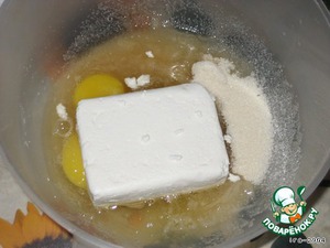 Растираем блендером яйца, сахар, соль и творог.