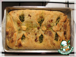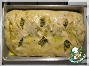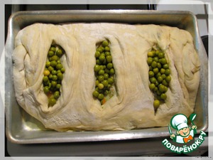 Выкладываем его на противень (лучше с высокими бортиками), смазанный растительным маслом. Делаем 3-4 поперечных разреза (только не прорезая донышко). Укладываем в них зеленый горошек.