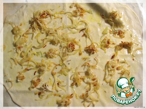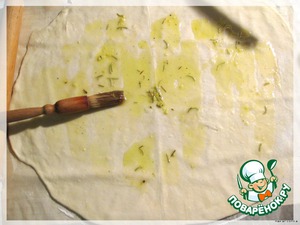 Время вернуться к тесту: посыпаем мукой бумагу для выпечки, тонко раскатываем на ней тесто до толщины примерно 2мм. Смазываем его нашим оливковым маслом со специями