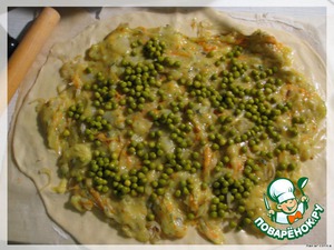 Затем картофельное пюре, а сверху – зеленый горошек.