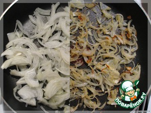 Порезанную полукольцами луковицу обжариваем до золотистого цвета. Потом в этой же сковородке немного «притушиваем» тертую морковку.