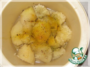 К отваренному картофелю добавляем соль (если требуется), оливковое масло, перец, пряности, можно добавить немного куркумы, что бы пюре получилось желтеньким и жизнерадостным.