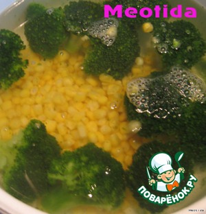 В кипящую подсоленную воду бросаем брокколи, горсть кукурузы и отвариваем, как только вода снова закипит, выключаем и откидываем на дуршлаг