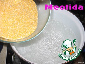 В большой кастрюльке надо вскипятить 1,5литра воды с 1ч. л. соли, размешивая венчиком, постепенно всыпать кукурузную крупу и варить, постоянно помешивая, деревянной ложкой на среднем огне минут 20-25, до густого состояния