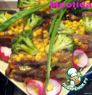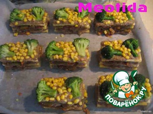 Закрываем последним прямоугольничком поленты, слегка придавливаем, чтобы слои легли поплотнее, смазываем грибным соусом, сверху выкладываем брокколи и кукурузку
