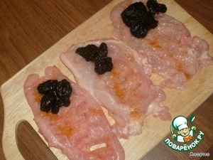 • Каждый отбитый кусок посолить, посыпать приправы по вкусу, выложить чернослив.