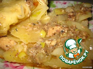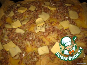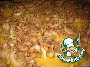 Картошку чистим и нарезаем тонкими колечками, выкладываем на тесто, Сайру (или другую рыбу) разминаем, режем лук и смешиваем, выкладываем на картофель, солим, перчим