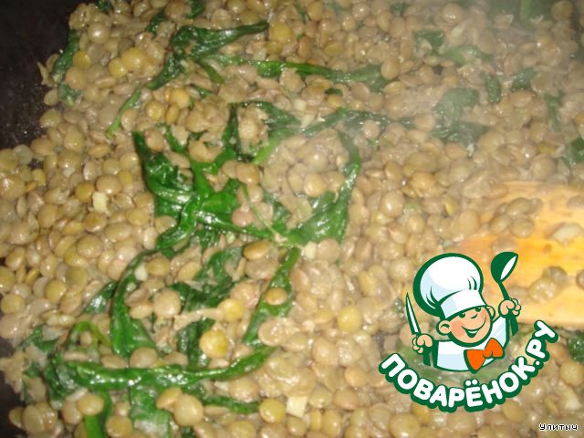 Добавляем к шпинату отваренную чечевицу ,опять помешиваем.