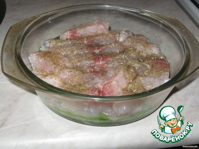 Рыбу (порезать на кусочки и присыпать приправой)...