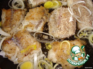 • И обжариваем с обеих сторон. Между рыбными кусочками бросаем лук. Обжаренные куски складываем тут же в сковороде друг на дружку, на свободное место - новые куски и еще подбрасываем лук, пока весь не используем.