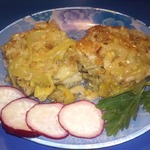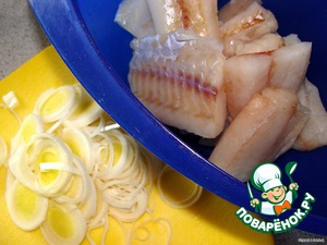 У меня филе трески. Все очень гармонично. Делал с репчатым луком, он кстати приобрел интересный оттенок во время готовки. Жалко чуть маловато его положила. Рыбка чудесная и вкусная. спасибо.