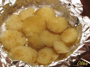 Форму застелить фольгой. Не много масла, выкладываем порезанный отварной картофель, солим, перчим.