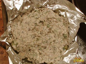 Смесь тертых на терке шампиньонов, рубленой зелени и майонеза. Все посыпать тертым сыром и в духовку минут на 30 при 180 градусах.