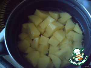 • Когда картошка станет совсем мягкой, снимает с огня и мнем ее толкушкой, добавляем воду и немного муки. Перемешиваем с овощами и укладываем в форму.
