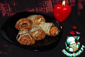 И складываем в вазочку наши блинные кулечки в форме букета. Оформляем зеленью, я сверху присыпала кедровыми орешками.
