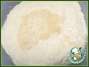 В миску высыпаем муку. В центре делаем углубление вливаем опару,воду. -