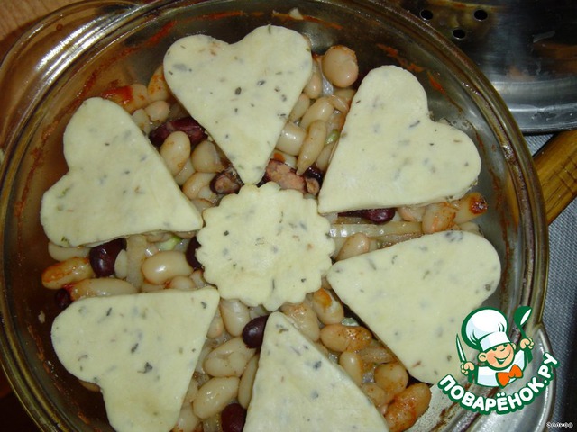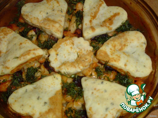 Для приготовления теста смешайте муку с солью, 2 чайными ложками смеси трав и содой. Добавьте масло и воду, и аккуратно перемешайте. Выложите на посыпанную мукой поверхность и слегка вымесите. Раскатайте тесто толщиной примерно 1 см. Выемкой вырежьте любые фигурки. Разложите их поверх запеченных овощей и вновь поставьте блюдо в духовку. Запекайте 30 мин. , пока лепешки не станут твердыми сверху.
