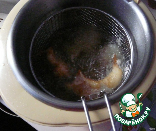 Подготовленные кальмары (нарезанные на полоски, на кольца) обмакнуть в кляр и обжарить во фритюрнице до золотистого цвета при 190 градусах. Удобнее без решетки и класть кусочки лучше руками.