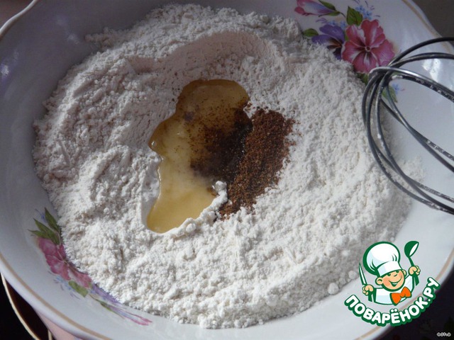В муку насыпать соли и перца, налить немного растительного масла. -