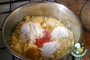 Добавить к ним томатную пасту,муку,щепотку сахара,1 чайную ложку карри,соль и 0,5 л воды.Перемешать.