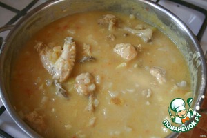 Положить в соус кусочки обжаренной курицы и потушить до готовности.В конце готовки влить лимонный сок и тщательно перемешать.