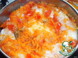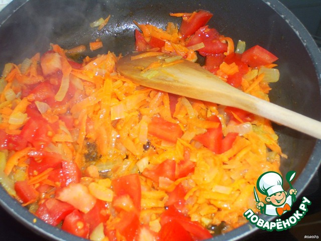 Делаем заливку. На масле растительном разжариваем лук, морковь, помидоры, добавляем немного муки, солим-перчим, кладем лавровый лист и наливаем воды, оставляем закипеть.