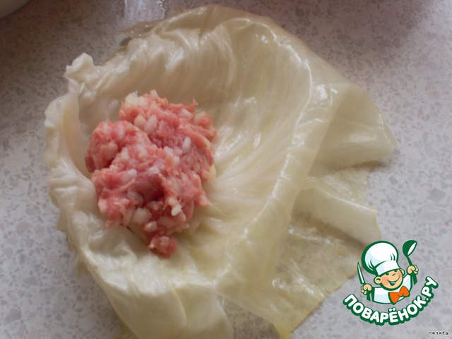 Отварную капусту разделываем на листья и выкладываем немного фарша