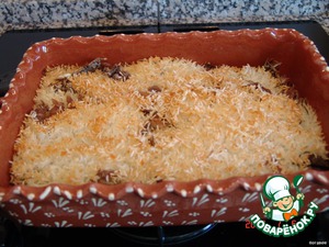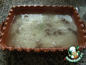 Заливаем в форму разбавленный водой (50/50) бульон от утки из расчета на одну ёмкость риса 2 емкости жидкости. Ставим в разогретую до 200С духовку и доводим до готовности.