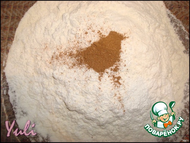 Просеять 1,5 стакана + 1 ч/л разрыхлителя + 1 ст/л сахарной пудры +0,5 ч/л корицы.Добавить холодное порезанное на кусочки масло ( или сливочный маргарин - 125 г. ) и приготовить отдельно 1 большое яйцо чуть взбитое с 1 ст/л воды.