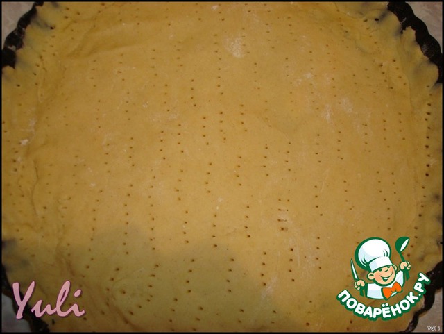 Тесто достать из холодильника,раскатать(стол чуть присыпать мукой).Переложить в форму,хорошенько наколоть вилочкой.Поставить в прогретую до 200 С духовку на 15 мин.