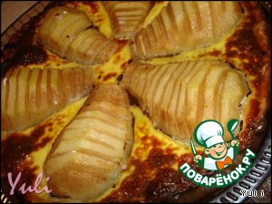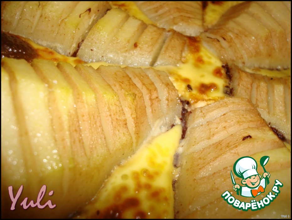 Груши очистить от кожуры и семечек.Надрезаем горизонтально на дольки,но не прорезаем до конца.