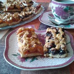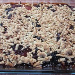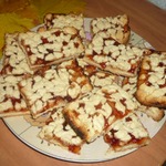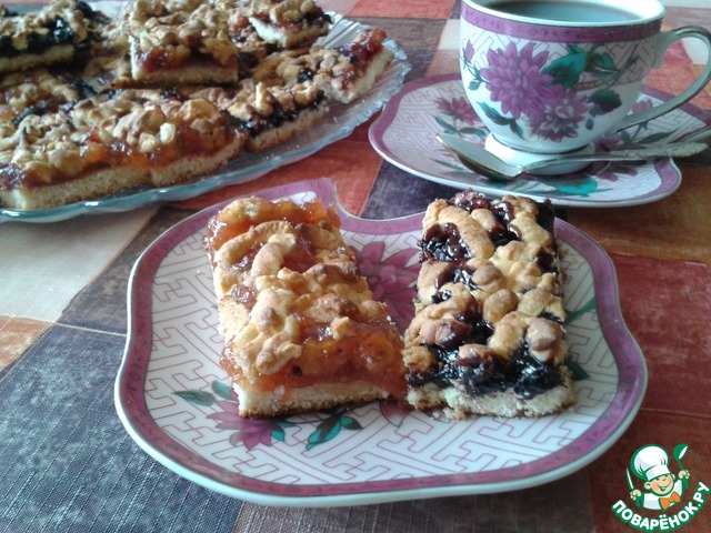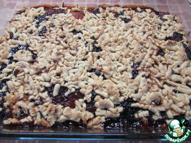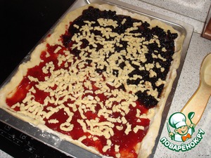 Выложить фруктовый джем ( у меня был клубничный и черносмородиновый). Сверху трем на тёрки оставшееся сырое тесто.