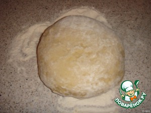 Замесить тесто: Взбить 2 яйца с сахаром и ванилином, порубить маргарин и добавить в яйца, добавить муку, хорошенько вымесить (тесто должно быть тугим).