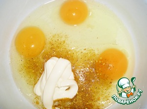 • Взбиваем яйца с любимыми приправками, водичкой и сметанкой.