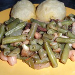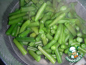 Сразу за луковицей в сковородку отправляется и слегка отваренная стручковая фасолька.