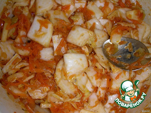 Как-то попробовала в корейском ресторане пекинскую капусту в двух видах. Мне очень понравилась. И когда я наткнулась на этот рецепт, подумала, что должно быть похоже. Оказалось не очень похоже, но не менее вкусно!!!!!!