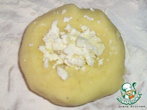 Сделать шарик и в нём не большое углубление, положить немного любой начинки (готовый фарш, грибы, сыр и т.д.)